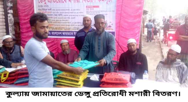 কুল্যা ইউনিয়ন ডক্টরস ফেডারেশনের সভাপতি ডাঃ মোঃ তাজ এর পৃষ্ঠপোষকতায় মশারী বিতরণ উপলক্ষে আলোচনা সভায় প্রধান অতিথি হিসেবে বক্তব্য রাখেন, কুল্যা ইউনিয়ন জামায়াতে আমীর মাওঃ ইউসুফ আলী মোড়ল। বিশেষ অতিথি ছিলেন নায়েবে আমীর মোঃ মেহেদী হাসান, কুল্যার মোড় বাজার ব্যবস্থাপনা কমিটির সভাপতি ডাঃ এস কে রাজা, কুল্যা জামায়াতের যুব বিভাগের সভাপতি রুবেল হোসেন, সহ সভাপতি মোঃ ইসরাফিল হোসেন, জামায়াত নেতা মোঃ নুরুজ্জামান, অবঃ শিক্ষক আলহাজ্ব আব্দুস ছামাদ, ইউনুছ ঢালী প্রমুখ। সভা শেষে কুল্যার মোড়ের বিভিন্ন প্রতিষ্ঠানে নিয়োজিত শ্রমিকদের মাঝে একটি করে ডেঙ্গু প্রতিরোধী মশারী বিতরণ করা হয়।