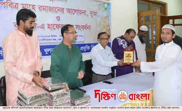 সংবাদ বিজ্ঞপ্তি : খুলনা প্রকৌশল ও প্রযুক্তি বিশ্ববিদ্যালয় (কুয়েট) এর অফিসার্স এসোসিয়েশনের আয়োজনে ২৮ মার্চ ২০২৪ রোজ বৃহস্পতিবার বিশ্ববিদ্যালয়ের গেস্ট হাউজ কাম ক্লাব ভবনের মাল্টিপারপাস কক্ষে পবিত্র মাহে রমজানের আলোচনা, দুআ ও কুরআন এ হাফেজদের সংবর্ধনা অনুষ্ঠিত হয়েছে। অনুষ্ঠানে প্রধান অতিথি হিসেবে উপস্থিত ছিলেন বিশ্ববিদ্যালয়ের ভাইস-চ্যান্সেলর প্রফেসর ড. মিহির রঞ্জন হালদার এবং বিশেষ অতিথি হিসেবে উপস্থিত ছিলেন প্রো-ভাইস চ্যান্সেলর প্রফেসর ড. সোবহান মিয়া। অনুষ্ঠানে সভাপতিত্ব করেন অফিসার্স এসোসিয়েশনের সভাপতি প্রকৌশলী মোঃ আসলাম পারভেজ এবং পরিচালনা করেন সাধারণ সম্পাদক প্রকৌশলী মোঃ রুহুল আমিন।