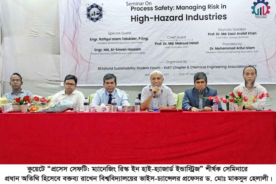 সংবাদ বিজ্ঞপ্তি : খুলনা প্রকৌশল ও প্রযুক্তি বিশ্ববিদ্যালয়ে (কুয়েট) বিইএওয়ার্ল্ড সাস্টেইনিবিলিটি স্টুডেন্ট ফোরাম-কুয়েট চ্যাপ্টার এন্ড কেমিক্যাল ইঞ্জিনিয়ারিং এসোসিয়েশনের আয়োজনে “প্রসেস সেফটি: ম্যানেজিং রিস্ক ইন হাই-হ্যাজার্ড ইন্ডাস্ট্রিজ” শীর্ষক সেমিনার অনুষ্ঠিত হয়েছে। সেমিনারটি আজ ২৪ সেপ্টেম্বর ২০২৫ রোজ বুধবার বিকালে বিশ্ববিদ্যালয়ের স্টুডেন্ট ওয়েলফেয়ার সেন্টারের সেমিনার কক্ষে অনুষ্ঠিত হয়। অনুষ্ঠানে প্রধান অতিথি হিসেবে উপস্থিত ছিলেন কুয়েটের ভাইস-চ্যান্সেলর প্রফেসর ড. মোঃ মাকসুদ হেলালী। বিশেষ অতিথি হিসেবে উপস্থিত ছিলেন বিইএওয়াল্ড নির্বাহী কমিটির সভাপতি ইঞ্জিনিয়ার রফিকুল ইসলাম তালুকদার, বিইএওয়ার্ল্ড নির্বাহী কমিটির সাধারণ সম্পাদক ইঞ্জিনিয়ার মোঃ আল-ইমরান হোসেন, সাধারন সম্পাদক-বাংলাদেশ চ্যাপ্টার ও রামপাল পাওয়ার প্লান্টের ইপিসি টাউনশিপ প্রজেক্টের ডেপুটি প্রজেক্ট ম্যানেজার (সিএফএমসিসি) ইঞ্জিনিয়ার নাজমুল ইসলাম। সেমিনারে মূল প্রবন্ধ উপস্থাপন করেন সিনার্জি বিইএওয়ার্ল্ড এর প্রধান সম্পাদক প্রফেসর ড. মোঃ ইয়াসির আরাফাত খান। সেমিনারের সভাপতিত্ব করেন কুয়েট কেমিক্যাল ইঞ্জিনিয়ারিং এসোসিয়েশনের সভাপতি প্রফেসর ড. মোহাম্মদ আরিফুল ইসলাম। সেমিনারে বিশ্ববিদ্যালয়ের বিভিন্ন বিভাগের শিক্ষকগণ ও শিক্ষার্থীবৃন্দ উপস্থিত ছিলেন।
