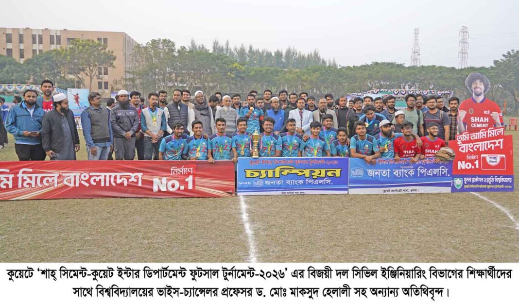 সংবাদ বিজ্ঞপ্তি : খুলনা প্রকৌশল ও প্রযুক্তি বিশ্ববিদ্যালয়ে (কুয়েট) ‘শাহ্ সিমেন্ট-কুয়েট ইন্টার ডিপার্টমেন্ট ফুটসাল টুর্নামেন্ট-২০২৬’ এর সমাপনী ও পুরস্কার বিতরণী অনুষ্ঠান সম্পন্ন হয়েছে। টুর্নামেন্টের জমজমাট ফাইনাল ম্যাচে ইসিই ডিপার্টমেন্টকে ১-০ গোলে পরাজিত করে চ্যাম্পিয়ন হয়েছে সিভিল ইঞ্জিনিয়ারিং বিভাগ। আজ ২০ জানুয়ারি ২০২৬ রোজ মঙ্গলবার বিশ্ববিদ্যালয়ের কেন্দ্রীয় খেলার মাঠে অনুষ্ঠিত সমাপনী অনুষ্ঠানে প্রধান অতিথি হিসেবে বিজয়ীদের হাতে পুরস্কার তুলে দেন বিশ্ববিদ্যালয়ের ভাইস-চ্যান্সেলর প্রফেসর ড. মোঃ মাকসুদ হেলালী। অনুষ্ঠানে সভাপতিত্ব করেন পরিচালক (ছাত্র কল্যাণ) প্রফেসর ড. বি. এম. ইকরামুল হক। টুর্নামেন্টে বিজয়ীরা হলো চ্যাম্পিয়ন সিভিল ইঞ্জিনিয়ারিং বিভাগ, রানার্স-আপ: ইসিই বিভাগ, ফেয়ার প্লে অ্যাওয়ার্ড: আইইএম বিভাগ, ম্যান অফ দ্য ফাইনাল মিজাইল (সিভিল ইঞ্জিনিয়ারিং বিভাগ), বেস্ট প্লেয়ার মোঃ আহাসান হাবিব আশিক (সিভিল ইঞ্জিনিয়ারিং বিভাগ), বেস্ট রাইজিং প্লেয়ার মোঃ ইমরুল হাসান (এমএসই বিভাগ), বেস্ট গোলকিপার ফাহিম ফয়সাল (এমএসই বিভাগ), টপ স্কোরার যৌথভাবে আহনাফ তাজওয়ার সাদী (সিএসই বিভাগ) এবং রবিউল ইসলাম (ইউআরপি বিভাগ)। পুরস্কার বিতরণী অনুষ্ঠানে বিশেষ অতিথি হিসেবে উপস্থিত ছিলেন বিভিন্ন বিভাগের শিক্ষক, শাহ্ সিমেন্ট ইন্ডাস্ট্রিজ লিঃ এবং জনতা ব্যাংক পিএলসি-এর প্রতিনিধিরা। উল্লেখ্য, গত ৮ জানুয়ারি শুরু হওয়া এই টুর্নামেন্টটি পাওয়ার্ড বাই হিসেবে ছিল ‘শাহ্ সিমেন্ট’ ও ‘জনতা ব্যাংক পিএলসি’ এবং সার্বিক আয়োজনে ছিল কুয়েটের পরিচালক (ছাত্র কল্যাণ) কার্যালয়।