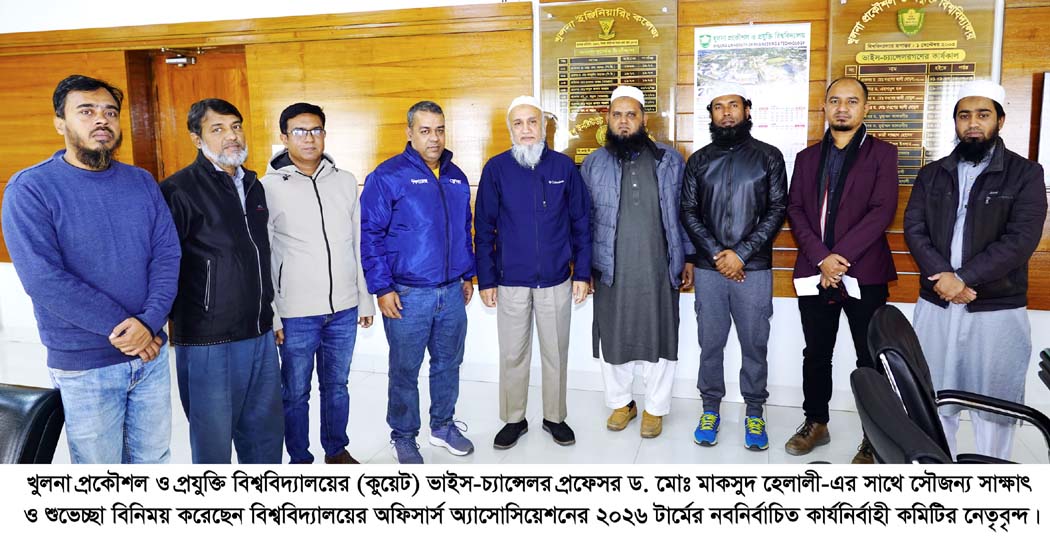 সংবাদ বিজ্ঞপ্তি : খুলনা প্রকৌশল ও প্রযুক্তি বিশ্ববিদ্যালয়ের (কুয়েট) ভাইস-চ্যান্সেলর প্রফেসর ড. মোঃ মাকসুদ হেলালী-এর সাথে সৌজন্য সাক্ষাৎ ও শুভেচ্ছা বিনিময় করেছেন বিশ্ববিদ্যালয়ের অফিসার্স অ্যাসোসিয়েশনের ২০২৬ টার্মের নবনির্বাচিত কার্যনির্বাহী কমিটির নেতৃবৃন্দ। আজ ০১ জানুয়ারি ২০২৫ রোজ বৃহস্পতিবার সকাল ১১টায় ভাইস-চ্যান্সেলর মহোদয়ের কার্যালয়ে এ সৌজন্য সাক্ষাৎ অনুষ্ঠিত হয়। অফিসার্স অ্যাসোসিয়েশনের নবনির্বাচিত সভাপতি মোঃ মঈনুল হক ও সাধারণ সম্পাদক মোঃ গোলাম কিবরিয়ার নেতৃত্বে নবনির্বাচিত কমিটির সদস্যরা সাক্ষাতে অংশগ্রহণ করেন।