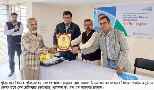 অনুষ্ঠানে মোঃ জামাল উদ্দিন এর হাতে সম্মাননা ক্রেস্ট তুলে দেওয়া হয়। এর আগে তাঁকে ফুল দিয়ে শুভেচ্ছা জানানো হয়। এ সময় ছাত্র বিষয়ক পরিচালকের দপ্তরের বিভিন্ন পর্যায়ের কর্মকর্তা ও কর্মচারীবৃন্দ উপস্থিত ছিলেন।