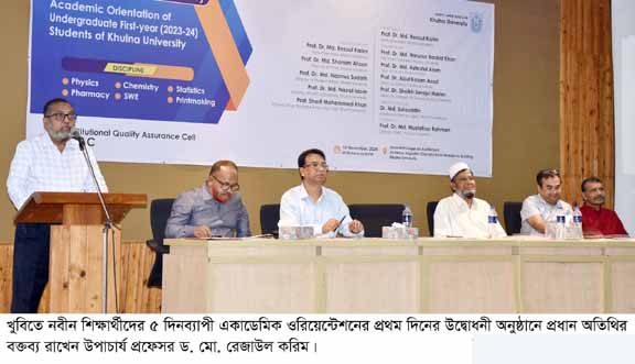 খুলনা বিশ্ববিদ্যালয়ের ২০২৩-২০২৪ শিক্ষাবর্ষের স্নাতক/স্নাতক (সম্মান) প্রথম বর্ষের ভর্তিকৃত শিক্ষার্থীদের ‘উইক অব ওয়েলকাম’ শীর্ষক ৫ দিনব্যাপী একাডেমিক ওরিয়েন্টেশন আজ ১০ নভেম্বর ২০২৪ রোজ রবিবার শুরু হয়েছে। সকাল ৯.৩০ মিনিটে আচার্য জগদীশচন্দ্র বসু একাডেমিক ভবনের সাংবাদিক লিয়াকত আলী মিলনায়তনে ওরিয়েন্টেশনের প্রথম দিনের উদ্বোধনী অনুষ্ঠানে প্রধান অতিথির বক্তব্য রাখেন উপাচার্য প্রফেসর ড. মো. রেজাউল করিম।