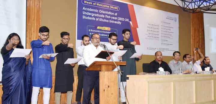 খুলনা বিশ্ববিদ্যালয়ের ২০২৩-২০২৪ শিক্ষাবর্ষের স্নাতক/স্নাতক (সম্মান) প্রথম বর্ষের ভর্তিকৃত শিক্ষার্থীদের ‘উইক অব ওয়েলকাম’ শীর্ষক ৫ দিনব্যাপী একাডেমিক ওরিয়েন্টেশনের তৃতীয় দিন অতিবাহিত হয়েছে। আজ ১২ নভেম্বর ২০২৪ রোজ মঙ্গলবার সকাল ৯.৩০ মিনিটে ওরিয়েন্টেশনের তৃতীয় দিনের উদ্বোধনী অনুষ্ঠান আচার্য জগদীশচন্দ্র বসু একাডেমিক ভবনের সাংবাদিক লিয়াকত আলী মিলনায়তনে অনুষ্ঠিত হয়।