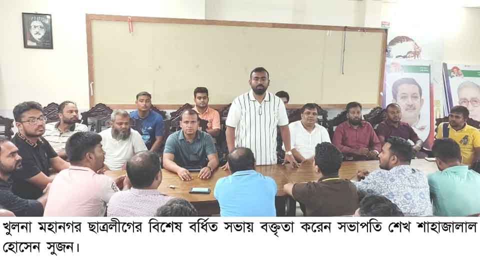 জাতির পিতা বঙ্গবন্ধু শেখ মুজিবুর রহমানের ৪৭ তম শাহাদাৎ বার্ষিকী ও শোকাবহ ১৫ আগস্ট উপলক্ষে খুলনা মহানগর ছাত্রলীগ আয়োজিত শোকসভা ও দোয়া মাহফিল সফল করার লক্ষে বিশেষ বর্ধিত সভা করেছে খুলনা মহানগর ছাত্রলীগ। আজ ২৭ আগস্ট ২০২২ রোজ শনিবার সন্ধ্যা ৭:৩০ ঘটিকায় শঙ্খ মাকের্টস্থ দলীয় কার্যালয়ে এ সভা অনুষ্ঠিত হয়। খুলনা মহানগর ছাত্রলীগের সভাপতি শেখ শাহাজালাল হোসেন সুজন এর সভাপতিত্বে এবং সাধারণ সম্পাদক আসাদুজ্জামান রাসেল এর পরিচালনায় অন্যানের মধ্যে উপস্থিত ছিলেন মোস্তফা শিকদার, মশিউর রহমান সুমন, সোহেল বিশ্বাস, তাজমুল হক তাজু, এস.এম মাসুদ হোসেন সোহান, রণবীর বাড়ই সজল, মাহামুদুল হাসান শাওন, জব্বার আলী হীরা, মিনহাজ সুজন, জহির আব্বাস, জুবি ওয়ালিয়া টুই, ইয়াসিন আলী, মো: সাব্বির হোসেন, মো: সুমন শেখ, কামরুল ইসলাম অপু, প্রনব চক্রবর্তী, মেহেদী হাসান, মাহামুদুর রহমান সুজন, শেখ শান্ত ইসলাম, শিকদার রাসেল, সোহান হোসেন শাওন, রেজোয়ান মোড়ল, তায়েজুল ইসলাম তাজ, ইবনুল হাসান, মাহামুদুর রহমান রাজেস, তরিকুল ইসলাম তুফান, এম.এ হোসেন সবুজ, বায়েজিদ সিনা, শেখ আল আমিন, জোয়েব সিদ্দিকী, মশিউর রহমান বাদশা, শংকর কুন্ডু, অভিজিৎ সরকার রাহুল, ওমর কামাল, সোহান সাদী, জীবন মোড়ল, শফিকুল ইসলাম মুন্না, জনি বসু, মামুনুর রহমান, রুমান আহমেদ, আতিকুর রহমান সোহাগ, শোভন হাওলাদার, চয়ন চৌধুরি, সাইফুল ইসলাম মিজান, মাসুদ আহমেদ সজল, বরকতউল্লা রাজ, আবিদ আল হাসান, হাসান শেখ, রাব্বি আহমেদ রানা, রাকিব আহমেদ রানা, ইমতিয়াজ মুন্না, রাহুল শাহারিয়ার, রিয়াদ খান প্রমুখ। সভায় আগামী ৩১ আগস্ট খুলনা মহানগর ছাত্রলীগ আয়োজিত শোকসভা ও দোয়া মাহফিল সফল করার জন্য মিছিল সহকারে উপস্থিত হওয়ার জন্য প্রতিটি ইউনিটকে নির্দেশ প্রদান করা হয়।