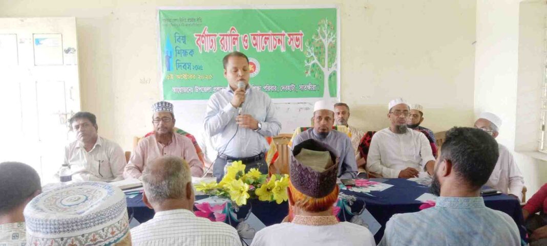 ইয়াছিন আলী, দেবহাটা (সাতক্ষীরা) প্রতিনিধি : দেবহাটা উপজেলা নির্বাহী অফিসার মিলন সাহা বলেছেন, জাতি বির্নিমানে শিক্ষকদের অবদান সর্ববৃহৎ। একজন আদর্শ শিক্ষকের দ্বারাই একটি আদর্শ ভবিষ্যৎ প্রজন্ম গড়ে উঠতে পারে। তাই পিতামাতার পরই শিক্ষকদের সম্মান সবাইকে বজায় রাখতে হবে। উপজেলা প্রশাসন ও উপজেলা মাধ্যমিক শিক্ষা পরিবারের আয়োজনে আজ ০৫ অক্টোবর ২০২৫ রোজ রবিবার সকাল ১১টায় উপজেলার সকল কলেজ, স্কুল ও মাদ্রাসার শিক্ষকদের নিয়ে বিশ্ব শিক্ষক দিবসের বর্ণাঢ্য র্যালি পরবর্তী আলোচনা সভায় প্রধান অতিথির বক্তব্যে উপরোক্ত কথাগুলো বলেন দেবহাটা উপজেলা নির্বাহী অফিসার মিলন সাহা। সখিপুর ফাজিল ডিগ্রি মাদ্রাসা মিলনায়তনে অধ্যক্ষ মাওঃ ইয়াকুব আলীর সভাপতিত্বে অনুষ্ঠিত অনুষ্ঠানে প্রধান অতিথি হিসেবে ইউএনও মিলন সাহা আরো বলেন, আমরা এখানে যারা উপস্থিত হয়েছি তারা কোন না কোন শিক্ষকের ছাত্র। দেশকে আরো উন্নত করতে হলে যেমন শিক্ষকদেরকে সুপরামর্শক, সুচিন্তক ও সুপরামর্শক হতে হবে তেমনি শিক্ষকদের ন্যায্য দাবি দাবা পূরণে সরকারকে এগিয়ে আসতে হবে। উক্ত অনুষ্ঠানে আরো বক্তব্য রাখেন উপজেলা মাধ্যমিক শিক্ষা অফিসের একাডেমিক সুপারভাইজার মিজানুর রহমান, শিক্ষকদের পক্ষে বক্তব্য রাখেন হাজী কেয়ামউদ্দিন মেমোরিয়াল মহিলা কলেজের অধ্যাপক নজরুল ইসলাম, সরকারি খান বাহাদুর আহছানউল্লাহ কলেজের মোঃ আবু তালেব, কোমরপুর দাখিল মাদ্রাসার মাওলানা অলিউল ইসলাম ও পারুলিয়া মাধ্যমিক বালিকা বিদ্যালয়ের প্রধান শিক্ষক নজরুল ইসলাম। অনুষ্ঠানটি সঞ্চালনা করেন উক্ত মাদ্রাসার শিক্ষক তবিবুর রহমান।