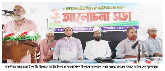 আলোচনা সভায় জামায়াতে ইসলামী সাতক্ষীরা জেলা শাখার নায়েবে আমির শেখ নূরুল হুদা বলেছেন,’৭ নভেম্বরের চেতনা ও ছাত্র-জনতার ৫ আগস্টের বিপ্লব একসূত্রে গাঁথা। আল্লাহ তাআলার তরফ থেকে এ জাতির প্রতি, এই উম্মার প্রতি পরীক্ষার পর পরীক্ষার মধ্যদিয়ে একটা নতুন বাংলাদেশের অভিযাত্রা, নতুন দিগন্ত আল্লাহ তাআলা সূচনা করেছে।