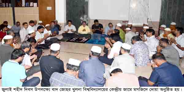 জুলাই শহিদ দিবস উপলক্ষ্যে আজ ১৬ জুলাই ২০২৫ রোজ বুধবার খুুলনা বিশ্ববিদ্যালয়ে জাতীয় পতাকা অর্ধনমিতকরণ, দোয়া এবং বৃক্ষরোপণ কর্মসূচি পালিত হয়েছে। দিবসের শুরুতে সকালে সরকারি নির্দেশনা মোতাবেক রাষ্ট্রীয় শোক পালনের অংশ হিসেবে বিশ্ববিদ্যালয় প্রশাসনের পক্ষ থেকে জাতীয় পতাকা অর্ধনমিত করা হয়। বাদ জোহর বিশ্ববিদ্যালয়ের কেন্দ্রীয় জামে মসজিদে জুলাই শহিদদের আত্মার মাগফেরাত কামনায় দোয়া অনুষ্ঠিত হয়।