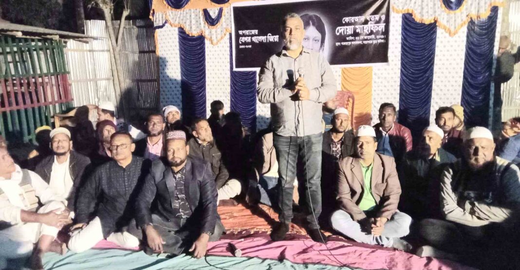 সুজিত মল্লিক, ডুমুরিয়া (খুলনা) প্রতিনিধি : ডুমুরিয়ার সাহস ইউনিয়নের গজেন্দ্রপুরে সাবেক প্রধানমন্ত্রী দেশনেত্রী বেগম খালেদা জিয়ার রুহের মাগফেরাত কামনায় কোরআন তেলয়াত, দোয়া ও স্বরনসভা অনুষ্ঠিত হয়েছে। আজ ৩১ জানুয়ারি ২০২৬ রোজ শনিবার সন্ধ্যায় গজেন্দ্রপুর বাদামতলা মদীনা লিল্লাহ বোডিং ও এতিম খানা মিলনায়তনে অনুষ্ঠানে সভাপতিত্ব করেন এজার আলি গাজী। অনুষ্ঠানে প্রধান অতিথি ছিলেন উপজেলা বিএনপির সাবেক আহবায়ক মোল্যা মোশাররফ হোসেন মফিজ। বিশেষ অতিথি ছিলেন উপজেলা বিএনপির যুগ্ন আহবায়ক শেখ শাহিনুর রহমান,শেখ মশিউর রহমান লিটন,শেখ ফরহাদ হোসেন,এ্যাডভোকেট মনিমুর রহমান নয়ন,বদরুজ্জামান বাবলু। অন্যান্যের মধ্যে বক্তব্য রাখেন উপজেলা শ্রমিকদল সভাপতি শেখ ফরিদুল ইসলাম,শাহানুর রহমান শাহিন, নাজমুল হুদা মিঠু, বিএনপি নেতা মশিউর রহমান, উপজেলা ছাত্রদল সাধারণ সম্পাদক মনিরুজ্জান সোহাগ, মোঃ বদরুজ্জান বাবলু, জাহিদুর রহমান শেখ, ইউপি সদস্য শেখ আঃ রশিদ, মেম্বর আঃ মজিদ, আব্দৃর রশিদ, আফজাল বিশ্বাস, আহসান হাবিব, জয়নাল আবেদীন তানবীর হোসেন, মকবুল সরদার, খালিদ হোসেন, শেখ নাসির, বায়োজিদ হোসেন প্রমুখ। দোয়া অনুষ্ঠান পরিচালনা করেন মাওলানা ওমর ফারুক।
