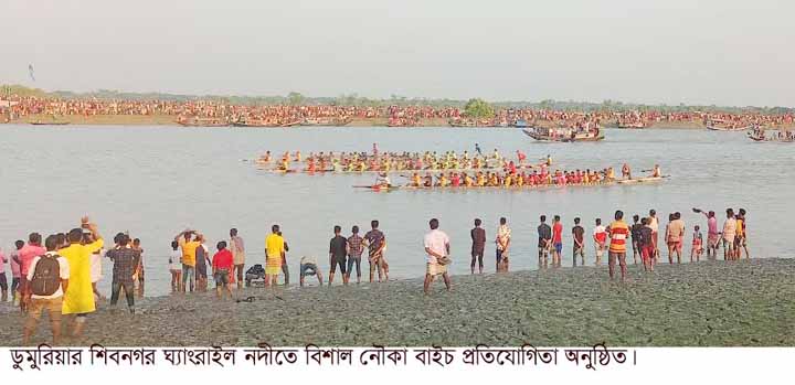 সুজিত মল্লিক, ডুমুরিয়া (খুলনা) প্রতিনিধি : ডুমুরিয়া উপজেলার শিবনগর ঘ্যাংরাইল নদীতে আজ ০২ নভেম্বর ২০২২ রোজ বুধবার বিকেলে গ্রাম বাংলার ঐতিহ্য তুলে ধরে বিশাল নৌকা বাইচ প্রতিযোগিতা অনুষ্ঠিত হয়েছে। কাত্যায়নী পূজা কমিটি আয়োজিত এ বাইচ প্রতিযোগিতায় মোট ৫টি দল অংশ গ্রহন করে। আকর্ষনীয় এ প্রতিযোগিতায় নৌকা দল গুলির মধ্যে পর পর তিন বার বাইচ অনুষ্ঠিত হয়। আর তিন বারই প্রথম স্থান অধিকার করে শোলাদানার মাসুমের রিয়া দল এবং দ্বিতীয় স্থান লাভ করে তালার চরগ্রামের পঙ্খিরাজ নৌকা দল, তৃতীয় হয় কেশবপুরের গৌরিঘোনা দল। খেলা শেষে ইউপি চেয়ারম্যান বিমল কৃষ্ণ সানার সভাপতিত্বে পুরস্কার বিতরণ সভা অনুষ্ঠিত হয়। এ সময় উপস্থিত ছিলেন শরাফপুরের চেয়ারম্যান শেখ রবিউল ইসলাম রবি, পূজা কমিটির সাধারণ সম্পাদক দিলিপ মন্ডল, আওয়ামী লীগ নেতা প্রভাষক সুকৃতি মন্ডল, জামিনী রঞ্জন সানা, উদয় মন্ডল, ইউপি সদস্য ভবেন্দ্রনাথ বালা, চিত্ত রঞ্জন মন্ডল, উদয় মল্লিক, অনিমেষ মন্ডল, বিশ্বজিত মন্ডল, সুব্রত গোলদার প্রমুখ। অতিথিরা চ্যাম্পিয়ন দলকে একটি ফ্রিজ ও দ্বিতীয় দলকে একটি কালার মনিটার পুরস্কার দেন। তবে গ্রামীণ এ বাইচ প্রতিযোগিতা দেখতে বিকাল থেকেই ছিল জনতার উপছে পড়া ভীড়। নদীর দু’কুল জুড়েই ছিল মানুষে মানুষে পরিপূর্ণ।