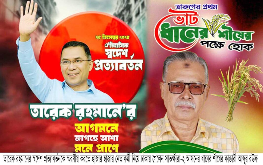 সাতক্ষীরা প্রতিনিধি : দীর্ঘ ১৭ বছর পর আগামী (২৫ ডিসেম্বর) দেশে ফিরতে যাচ্ছেন বাংলাদেশ জাতীয়তাবাদী দল বিএনপি’র ভারপ্রাপ্ত চেয়ারম্যান দেশ নায়ক তারেক রহমান। প্রিয় নেতার স্বদেশ প্রত্যাবর্তন ও ৩০০ ফিটে সমাবেশ স্মরণীয় করে রাখতে ও সর্বোচ্চ লোক সমাগম ঘটাতে সাতক্ষীরা-২ (সাতক্ষীরা সদর-দেবহাটা) আসনসহ জেলার ৭টি উপজেলা থেকে হাজার হাজার নেতাকর্মী নিয়ে ঢাকায় গেলেন বিএনপি’র ভারপ্রাপ্ত চেয়ারম্যান তারেক রহমানের অত্যন্ত আস্থাভাজন আসন্ন ত্রয়োদশ জাতীয় সংসদ নির্বাচনে সাতক্ষীরা-২ (সাতক্ষীরা সদর-দেবহাটা) আসনে বাংলাদেশ জাতীয়তাবাদী দল বিএনপি মনোনীত ধানের শীষের কান্ডারী সাতক্ষীরা জেলা বিএনপির সাবেক সিনিয়র যুগ্ম আহবায়ক ও বারবার নির্বাচিত ইউপি চেয়ারম্যান গণমানুষের প্রাণপ্রিয় নেতা আলহাজ্ব মো. আব্দুর রউফ। তার নির্বাচনী এলাকাসহ জেলার নেতাকর্মী ও সমর্থকদের যাতায়াতের সুবিধার্থে সকল প্রস্তুতি নিয়ে ঢাকায় গিয়েছেন তিনি। ইতিমধ্যে তার অনেক কর্মী ও সমর্থকরা ঢাকার ৩০০ ফিটে সমাবেশ স্থলে পৌছে গেছে। আলহাজ্ব মো. আব্দুর রউফের নেতৃত্বে সাতক্ষীরা-২ তার নির্বাচনী এলাকার হাজার হাজার মানুষ ঢাকায় পৌঁছেছে বিএনপির ভারপ্রাপ্ত চেয়ারম্যান তারেক রহমানের স্বদেশ প্রত্যাবর্তন স্মরণীয় করে রাখতে।