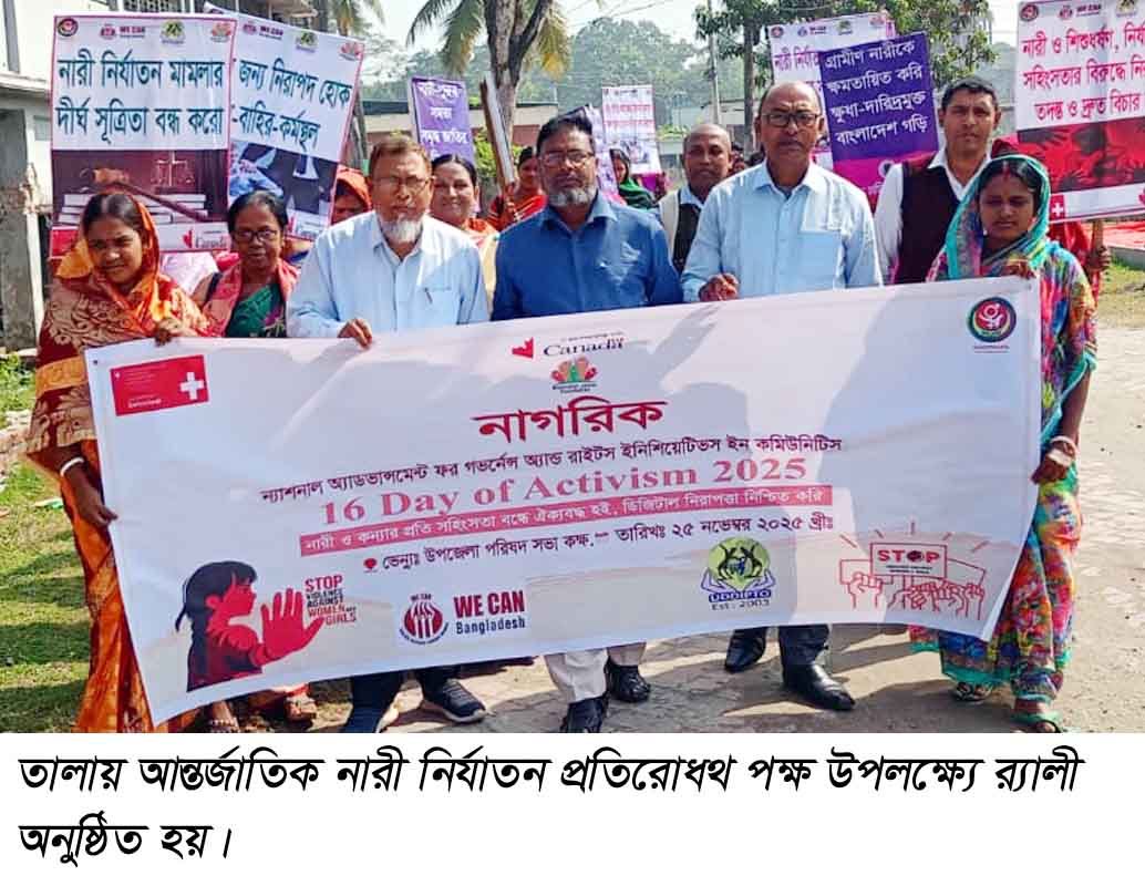 দিবসটি পালনে উদ্দীপ্ত মহিলা উন্নয়ন সংস্থার উদ্যোগে ও নাগরিক প্রকল্পের আওতায় আজ ২৫ নভেম্বর ২০২৫ রোজ মঙ্গলবার সকালে তালা উপজেলা পরিষদ চত্বর থেকে একটি র্যালী বের হয়। পরে উপজেলা পরিষদ হলরুমে অনুষ্ঠিত আলোচনা সভা উদ্দীপ্ত মহিলা উন্নয়ন সংস্থার ব্যবস্থাপনা কমিটির সভাপতি সোমা সরকারের সভাপতিত্বে অনুষ্ঠিত হয়। সভায় প্রধান অতিথি হিসেবে বক্তব্য রাখেন, উপজেলা প্রকল্প বাস্তবায়ন কর্মকর্তা মো. আশরাফ হোসেন। বিশেষ অতিথি হিসেবে বক্তব্য রাখেন, উপজেলা নির্বাহী অফিসারের কার্যলয়ের প্রশাসনিক কর্মকর্তা ফেরদৌস হোসেন রাশেদ। এসময় অন্যান্যের মধ্যে ইউডিএফ কর্মকর্তা মো. তালিম হোসেন, সমাজসেবা অফিসের মো. কবিরুজ্জামান, মহিলা বিষয়ক অফিসের দেবকী রানী রায়, সাংবাদিক মিজানুর রহমান, উন্নয়ন কর্মী ভবতোষ মন্ডল, ছায়া রানী বিশ^াস, দলিত নেত্রী স্বরস্বতী দাস প্রমুখ বক্তব্য রাখেন। এসময় সরকারি কর্মকর্তা, এনজিও প্রতিনিধি, সাংবাদিক, সুশিল সমাজ প্রতিনিধি, নারী নেতৃবৃন্দ ও দলিত নারী নেতৃবৃন্দ উপস্থিত ছিলেন।