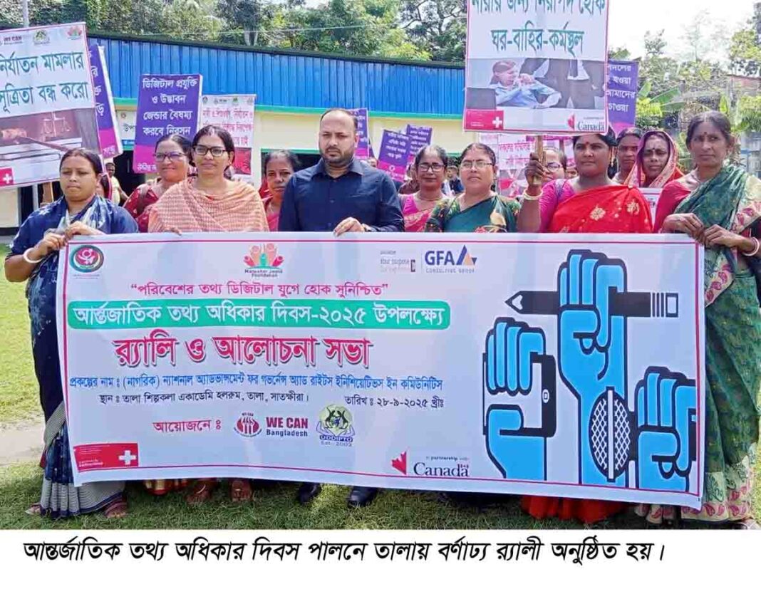 তালা (সাতক্ষীরা) প্রতিনিধি : পরিবেশের তথ্য ডিজিটাল যুগে হোক সুনিশ্চিত- প্রতিপাদ্য স্লোগান সামনে রেখে তালায় আন্তর্জাতিক তথ্য অধিকার দিবস-২৫ পালিত হয়েছে। বেসরকারি সংস্থা আমরাই পারি এবং উদ্দীপ্ত মহিলা উন্নয়ন সংস্থার আয়োজনে, নাগরিক প্রকল্পের মাধ্যমে দিবসটি পালনে আজ ২৮ সেপ্টেম্বর ২০২৫ রোজ রবিবার সকালে র‌্যালী ও আলোচনা সভা অনুষ্ঠিত হয়।