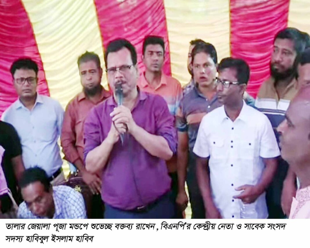 তালা (সাতক্ষীরা) প্রতিনিধি : শারদীয় দূর্গোৎসব উপলক্ষ্যে তালা উপজেলা বিভিন্ন দূর্গা পূজা মন্ডপ পরিদর্শন করেছেন বিএনপির কেন্দ্রীয় নেতা ও সাবেক সংসদ সদস্য হাবিবুল ইসলাম হাবিব। দূর্গা পূজা শুরু হবার পর থেকে বিগত ৩দিন ধরে তিনি তালা ও কলারোয়া উপজেলার পূজা মন্ডপগুলি পরিদর্শন করেন।