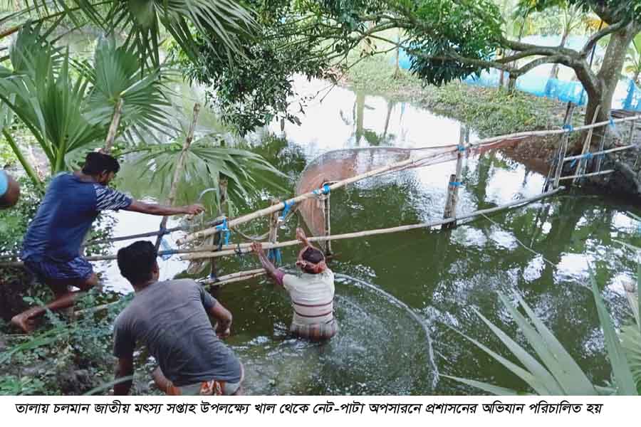 সিনিয়র তালা উপজেলা মৎস্য কর্মকর্তা তারিক ইমাম জানান, জলাবদ্ধতা নিরসন এবং দেশীয় মাছ উৎপাদন বৃদ্ধির লক্ষ্যে মঙ্গলবার তালা উপজেলার নওয়াপাড়া বাজার এলাকা ও এর আশেপাশের খালসহ গোপালপুর খালে ব্যাপক উচ্ছেদ অভিযান পরিচালনা করা হয়। এ অভিযানে প্রায় ২০টি স্থায়ী অবৈধ নেটা-পাটার স্থাপনা উচ্ছেদ করা হয়। একইসাথে অভিযান চলাকালে পাওয়া ১০টি চায়না দুয়ারি জাল, একটি বেহুন্দি জাল, বিভিন্ন প্রকার মাছ ধরার অবৈধ সরঞ্জাম ও নেট পাটা উদ্ধার করে পরে তাসব স্থানীয় জনগণের উপস্থিতিতে প্রকাশ্যে পুড়িয়ে ধ্বংস করা হয়।