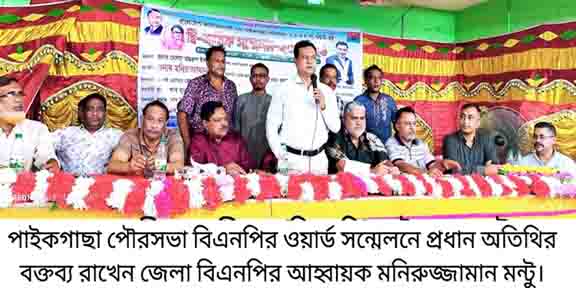 সন্মেলনে খুলনা জেলা বিএনপির আহবায়ক সাবেক ছাত্রনেতা মনিরুজ্জামান মন্টু বলেছেন, বিএনপিকে সুসংগঠিত করতে হলে তৃণমুল পর্যায় থেকে সম্মেলনের মাধ্যমে করতে হবে। এর কোন বিকল্প নেই। এটা তারেক রহমানের নির্দেশনা। তিনি বলেন, দেড় যুগ বিএনপির নেতাকর্মীরা সবচেয়ে বেশি গুম খুন নির্যাতনের শিকার হয়েছে। সম্মেলনে ৫ আগস্টে পূর্বে যারা দলের কর্মকাণ্ডে নিষ্ক্রিয় ছিল, যারা পরোক্ষভাবে আওয়ামী লীগের কর্মকাণ্ডের সাথে সম্পৃক্ত ছিল তাদের কমিটিতে স্থান দেওয়া হবে না। ভেদাভেদ ভুলে সকলকে ঐক্যের মাধ্যমে দলকে সুসংগঠিত করতে হবে। একটি রাজনৈতিক দল ইসলাম ধর্মের নাম তুলে ফায়দা হাসিল করতে চাই। সে ব্যাপারে দলীয় নেতা-কর্মীদের সজাগ থাকার আহবান জানান। আজ ১০ জুলাই ২০২৫ রোজ বৃহস্পতিবার সকালে পাইকগাছা প্রেসক্লাব মিলনায়তনে অনুষ্ঠিত সম্মেলনে প্রধান অতিথির বক্তৃতায় তিনি এসব কথা বলেন। পাইকগাছা পৌরসভা বিএনপির আহবায়ক সাবেক ছাত্রনেতা আসলাম পারভেজ এর সভাপতিত্বে অনুষ্ঠিত সম্মেলনের উদ্বোধন করেন জেলা বিএনপির যুগ্ম আহবায়ক মোল্যা খায়রুল ইসলাম। বিশেষ অতিথি ছিলেন, জেলা কমিটির সিনিয়র যুগ্ম আহবায়ক অ্যাড. মোমরেজুল ইসলাম, খান জুলফিকার আলী জুলু, জিএম কামরুজ্জামান টুকু, এনামুল হক সজল, উপজেলা বিএনপির সম্মেলন প্রস্তুতি কমিটির আহবায়ক ডা. আব্দুল মজিদ ও সদস্য সচিব এস এম ইমদাদুল হক। পৌর বিএনপির সম্মেলন প্রস্তুতি কমিটির যুগ্ম আহবায়ক সেলিম রেজা লাকী, কামাল আহম্মেদ সেলিম নেওয়াজ ও মোহর আলী অনুষ্ঠান সঞ্চালনা করেন । এসময় উপজেলা বিএনপির ১নং যুগ্ম আহবায়ক তহিদুজ্জামান মুকুল, যুগ্ম আহবায়ক আবুল হোসেন, সদস্য এসএম এমদাদুল ইসলাম, শেখ শাহাদাত হোসেন ডাবলু, তুষার কান্তি মন্ডল, আবু তালেব, অ্যাড. একরামুল হক ও সরদার ফারুক হোসেন সহ উপজেলা ও পৌরসভার বিভিন্ন পর্যায়ের নেতা কর্মীরা উপস্থিত ছিলেন। সম্মেলনে ১নং ওয়ার্ডে সম্পাদক পদে মোঃ রুহুল আমিন সরদার ৪৩ ভোট পেয়ে নির্বাচিত হয়েছেন। প্রতিদ্বন্দ্বী প্রার্থী মোঃ আব্দুর রহমান জনি’র প্রাপ্ত ভোট (২২)। আর সকল প্রার্থীরা বিনা প্রতিদ্বন্দ্বিতায় নির্বাচিত হয়েছেন। ১নং ওয়ার্ড সভাপতি মোহাম্মদ আলী গাজী, সাংগঠনিক সম্পাদক মোঃ বেলাল হোসেন গাজী। ২নং ওয়ার্ডে সভাপতি মোঃ মনিরুল ইসলাম, সেক্রেটারি রুবেল সরদার এবং সাংগঠনিক সম্পাদক আনারুল ইসলাম গাজী। ৫নং ওয়ার্ডে সভাপতি শাহিবুদ্দীন আহম্মেদ, সেক্রেটারি মোশারফ হোসেন বাবলু এবং সাংগঠনিক সম্পাদক জিএম জাকির হোসেন। নির্বাচনের দায়িত্বে ছিলেন সাবেক ছাত্রনেতা সাংবাদিক জি এম মিজানুর রহমান মিজান, প্রণব কান্তি মন্ডল, অ্যাড. একরামুল হক এবং প্রভাষক আবু সাঈদ।