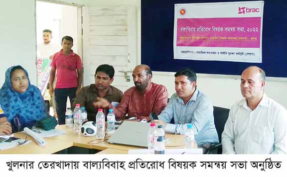 তেরখাদা (খুলনা) প্রতিনিধি : তেরখাদায় উপজেলা পরিষদ মিলনায়তনে আজ ২৩ জুন ২০২২ রোজ বৃহস্পতিবার বিকেল ৩টায় উপজেলা প্রশাসন ও মহিলা বিষয়ক অধিদপ্তরের উদ্যোগে এবং ব্র্যাকের সামাজিক ক্ষমতায়ন ও আইনী সুরক্ষা কর্মসূচীর সহযোগিতায় বাল্য বিবাহ প্রতিরোধ বিষয়ক এক সমন্বয় সভা অনুষ্ঠিত হয়েছে।
