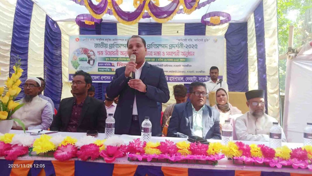 ইয়াছিন আলী, দেবহাটা (সাতক্ষীরা) প্রতিনিধি : দেবহাটায় উপজেলা প্রানী সম্পদ দপ্তর ও ভেটেরিনারি হাসপাতালের আয়োজনে জাতীয় প্রানী সম্পদ সপ্তাহ-২৫ ও প্রদর্শনীর উদ্বোধনী অনুষ্ঠান অনুষ্ঠিত হয়েছে। আজ ২৬ নভেম্বর ২০২৫ রোজ বুধবার সকাল ১১ টায় উপজেলা প্রাণিসম্পদ দপ্তর ও ভেটেরিনারি হাসপাতাল চত্বরে এ অনুষ্ঠান অনুষ্ঠিত হয়। এতে সভাপতিত্ব করেন দেবহাটা উপজেলা প্রাণিসম্পদ কর্মকর্তা ডাঃ মোঃ সাজেদুল ইসলাম। প্রধান অতিথি হিসেবে উপস্থিত ছিলেন দেবহাটা উপজেলা নির্বাহী অফিসার মিলন সাহা। বিশেষ অতিথি হিসেবে উপস্থিত ছিলেন উপজেলা বিএনপির সাবেক সদস্য সচিব ও জেলা বিএনপির আহবায়ক কমিটির সদস্য মহিউদ্দিন সিদ্দিকী, জেলা জামাতের সহকারী সেক্রেটারি মাহবুবুল আলম, উপজেলা জামায়াতের আমির মাওঃ অলিউল ইসলাম ও উপজেলা সমাজসেবা কর্মকর্তা তরিকুল ইসলাম। এছাড়া অন্যানের মধ্যে উপস্থিত ছিলেন যুব উন্নয়ন কর্মকর্তা আহমেদ তাহমীর সিদ্দিকী, উপজেলা পল্লী উন্নয়ন কর্মকর্তা সন্দীপ কুমার মন্ডল, দেবহাটা রিপোর্টার্স ক্লাবের সাধারণ সম্পাদক মেহেদী হাসান কাজল, বৈষম্য বিরোধী ছাত্র আন্দোলনের সাতক্ষীরা জেলা কমিটির সাবেক সদস্য ইমরান বাসার, বৈষম্য বিরোধী ছাত্র আন্দোলনের দেবহাটার সাবেক আহবায়ক মুজাহিদ বিন ফিরোজ প্রমুখ। এই মেলা চলবে সপ্তাহব্যাপী। মেলায় বিভিন্ন ধরনের ৩০ টি স্টল বসেছে। আলোচনা শেষে প্রধান অতিথিসহ সকলে স্টল পরিদর্শন করেন।