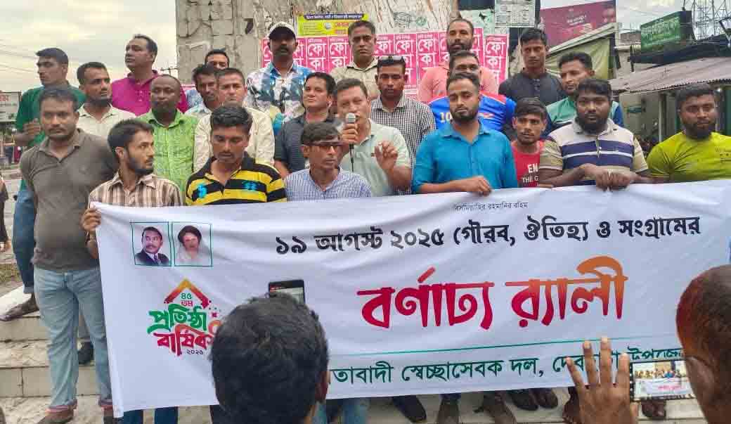 ইয়াছিন আলী, দেবহাটা (সাতক্ষীরা) প্রতিনিধি : দেবহাটায় উপজেলা স্বেচ্ছাসেবক দলের আয়োজনে স্বেচ্ছাসেবক দলের প্রতিষ্টা বার্ষিকী উপলক্ষ্যে বর্নাঢ্য র‌্যালি ও সমাবেশ অনুষ্ঠিত হয়েছে। র‌্যালিটি পারুলিয়া ও সখিপুরের প্রধান প্রধান সড়ক প্রদক্ষিন করে সখিপুর মোড়ে এক সমাবেশ অনুষ্ঠিত হয়। সমাবেশে সভাপতিত্ব করেন দেবহাটা উপজেলা স্বেচ্ছাসেবক দলের আহবায়ক জাহাঙ্গীর কবির পল্টু। প্রধান অতিথি হিসেবে উপস্থিত ছিলেন জেলা স্বেচ্ছাসেবক দলের যুগ্ম আহবায়ক মঞ্জুর মোর্শেদ মিলন। উপজেলা স্বেচ্ছাসেবক দলের সদস্য সচিব শহিদুল ইসলাম বাবুর সঞ্চালনায় সমাবেশে অন্যান্যের মধ্যে উপস্থিত ছিলেন ও বক্তব্য রাখেন জেলা স্বেচ্ছাসেবক দলের যুগ্ম আহবায়ক তানভির মজিদ, জেলা স্বেচ্ছাসেবক দলের সদস্য শামিউল ইসলাম, উপজেলা স্বেচ্ছাসেবক দলের সিনিয়র যুগ্ম আহবায়ক আহম্মদ আলী, উপজেলা স্বেচ্ছাসেবক দলের যুগ্ম আহবায়ক সাইদুর রহমান মিন্টু, যুগ্ম আহবায়ক আলমগীর কবির, দেবহাটা সদর ইউনিয়ন স্বেচ্ছাসেবক দলের আহবায়ক মহাসিন আলী, সদস্য সচিব হাবিবুল্লাহসহ উপজেলার ৫টি ইউনিয়নের স্বেচ্ছাসেবক দলের আহবায়ক, যুগ্ম আহবায়ক ও সদস্য সচিবসহ সকল নেতৃবৃন্দ। এসময় বক্তারা স্বেচ্ছাসেবক দলের ৪৫তম প্রতিষ্টা বার্ষিকীর সফলতা কামনা করে বলেন, বিএনপির প্রতিষ্টাতা শহীদ প্রেসিডেন্ট জিয়াউর রহমানের যে আদর্শ সেটা বুকে ধারন করে আগামীতে দেশনেত্রী বেগম খালেদা জিয়া ও বিএনপির ভারপ্রাপ্ত চেয়ারম্যান তারেক রহমানের দিক নির্দেশনার আলোকে আগামীর বাংলাদেশ বির্নিমানে সকল নেতাকর্মীদেরকে একসাথে কাজ করতে হবে। আগামীর সংসদ নির্বাচনে বিএনপি মনোনীত প্রার্থী যেন বিজয়ী হতে পারে সেলক্ষ্যে তৃনমূল পর্যায় থেকে সংগঠনকে মজবুত করতে হবে।