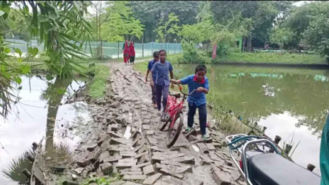 ইয়াছিন আলী, দেবহাটা (সাতক্ষীরা) প্রতিনিধি : দেবহাটা উপজেলার নাংলা উত্তর নওয়াপাড়া সরকারি প্রাথমিক বিদ্যালয়ের সংযোগ রাস্তাটি বর্তমানে চলাচলের অনুপযোগী হয়ে পড়েছে। দীর্ঘদিন ধরে রাস্তাটির কোনো সংস্কার না হওয়ায় সৃষ্টি হয়েছে খানাখন্দ, কাদাপানিতে ভরে আছে পুরো পথ। এতে সবচেয়ে বেশি ভোগান্তিতে পড়েছে পথচারীদের সাথে বিদ্যালয়ের ছোট ছোট ছাত্র-ছাত্রী ও অভিভাবকরা। সরেজমিনে দেখা গেছে, উপজেলার নাংলা উত্তর নওয়াপাড়া সরকারী প্রাথমিক বিদ্যালয়টি উপজেলা সদর থেকে আনুমানিক সাড়ে ৩ কিলোমিটারের দুরত্ব। এটি নওয়াপাড়া ইউনিয়নের আওতাভুক্ত। স্কুলটিতে যেতে প্রধান সড়ক থেকে একটি ইট সোলিং রাস্তা আছে। ইট সোলিং রাস্তাটি আনুমানিক ২ শত ফুট বা তার একটু বেশি হতে পারে। এখানে একটি সাইক্লোন সেন্টার আছে। ইট সোলিং রাস্তাটির মাঝে মাঝে এমন অবস্থা স্কুলগামী শিক্ষার্থীদের যেকোন সময় পার্শ্ববর্তী পুকুরে পড়ে যাওয়ার সম্ভাবনা আছে। বর্ষাকালে প্রতিদিনই কোমলমতি শিশুরা ভেজা কাপড়ে ও কষ্ট করে স্কুলে পৌঁছায়। বৃষ্টির দিনে এই দুর্ভোগ আরও ভয়াবহ রুপ নেয়। শিক্ষার পরিবেশ বিঘ্নিত হওয়ার পাশাপাশি, যেকোনো সময় বড় ধরনের দুর্ঘটনার আশঙ্কাও রয়েছে। স্থানীয় অভিভাবক, শিক্ষক ও এলাকাবাসীরা দ্রুত রাস্তাটি পাকা করার দাবি জানিয়েছেন উপজেলা প্রশাসন ও সংশ্লিষ্ট কর্তৃপক্ষের প্রতি। এবিষয়ে নওয়াপাড়া ইউনিয়নের ভারপ্রাপ্ত চেয়ারম্যান মোনায়েম হোসেন বলেন, তিনি গতবছর এখানে একটি বরাদ্দ দিয়েছিলেন। কিন্তু এবছর বর্ষাকালে আবারো নষ্ট হয়ে গেছে। তিনি অবিলম্বে এবিষয়ে ব্যবস্থা নেবেন বলে জানান। একটি চলাচলযোগ্য রাস্তা শিশুদের শিক্ষার পথকে সহজ করতে পারে এই দাবি বাস্তবায়নে জরুরি পদক্ষেপ প্রয়োজন নেয়া হবে বলে ভুক্তভোগীরা আশাবাদ ব্যক্ত করেছেন।