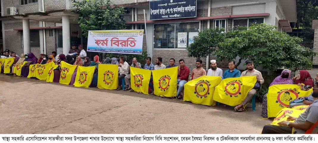 বাংলাদেশ সরকারের স্বাস্থ্য ও পরিবার কল্যাণ মন্ত্রণালয়ের অধীনস্থ সম্প্রসারিত ঠিকাদান কর্মসূচি ইপিআই সহ তৃণমূল পর্যায়ের স্বাস্থ্যসেবার কাজে কর্মরত স্বাস্থ্য পরিদর্শক, সহকারি স্বাস্থ্য পরিদর্শক ও স্বাস্থ্য সহকারীদের দাবিকৃত নিয়োগ বিধি সংশোধন, ইন সার্ভিস ট্রেনিং ও ১৪তম গ্রেডে আপগ্রেডেশনসহ ৬ দফা দাবি বাস্তবায়নের লক্ষ্যে ইপিআই আসন্ন টাইফয়েড টিকা ক্যাম্পেইনসহ সকল প্রকার কার্যক্রম ০১/১০/২০২৫ তারিখ হতে বর্জন করে অনির্দিষ্টকালের জন্য কর্মবিরতি পালন করছে বাংলাদেশ হেলথ্ এ্যাসিস্ট্যান্ট অ্যাসোসিয়েশন সাতক্ষীরা সদর উপজেলা শাখার নেতৃবৃন্দ।