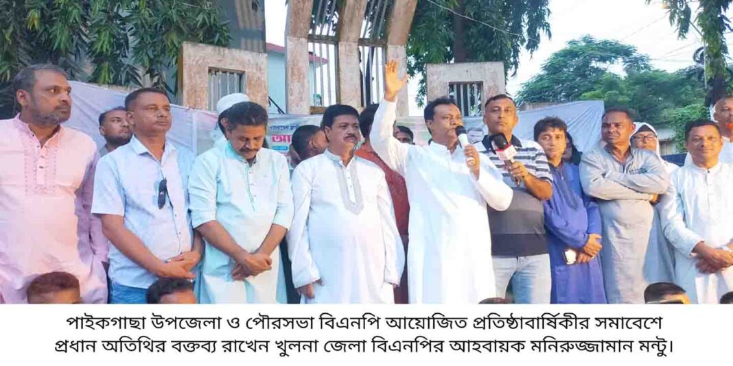 আজ ০৩ সেপ্টেম্বর ২০২৫ রোজ বুধবার বিকালে পাইকগাছা পৌরসভা মাঠে উপজেলা ও পৌরসভা বিএনপি আয়োজিত প্রতিষ্ঠাবার্ষিকীর অনুষ্ঠানে প্রধান অতিথির বক্তৃতায় এ-সব কথা বলেন। উপজেলা বিএনপির আহবায়ক ডাঃ আব্দুল মজিদের সভাপতিত্বে ও উপজেলা বিএনপির সদস্য সচিব সাবেক প্যানেল মেয়র এসএম ইমদাদুল হক এবং যুগ্ম আহবায়ক আবুল হোসেন এর সঞ্চালনায় অনুষ্ঠানে বিশেষ অতিথি ছিলেন পৌরসভা বিএনপির আহবায়ক আসলাম পারভেজ, জেলা বিএনপি নেতা এডভোকেট জিএম আব্দুস সাত্তার, সাবেক ইউপি চেয়ারম্যান শাহদাত হোসেন ডাবলু, শেখ ইমাদুল ইসলাম, শেখ শামসুল আলম পিন্টু, উপজেলা বিএনপি নেতা তৌহিদুজ্জামান মুকুল, সাবেক কাউন্সিলর কামাল আহমেদ সেলিম নেওয়াজ, কাজী সাজ্জাদ আহমেদ মানিক, শেখ বেনজির আহমেদ লাল, তুষার কান্তি মন্ডল, আবু তালেব, এডভোকেট একরামুল হক বিশ্বাস, সরদার ফারুক আহমেদ, সেলিম রেজা লাকি ও এসএম মোহর আলী। উপস্থিত ছিলেন বিএনপি ও অঙ্গ সহযোগী সংগঠনের আহবায়ক, সভাপতি, সম্পাদক ও সদস্য সচিব সহ বিভিন্ন পর্যায়ের নেতৃবৃন্দ। সমাবেশ শেষে জেলা বিএনপির আহবায়ক মনিরুজ্জামান মন্টু দলীয় নেতাকর্মীদের মাঝে বিভিন্ন প্রজাতির গাছের চারা এবং মধুমিতা পার্কের পুকুরে মাছের পোনা অবমুক্ত করেন।