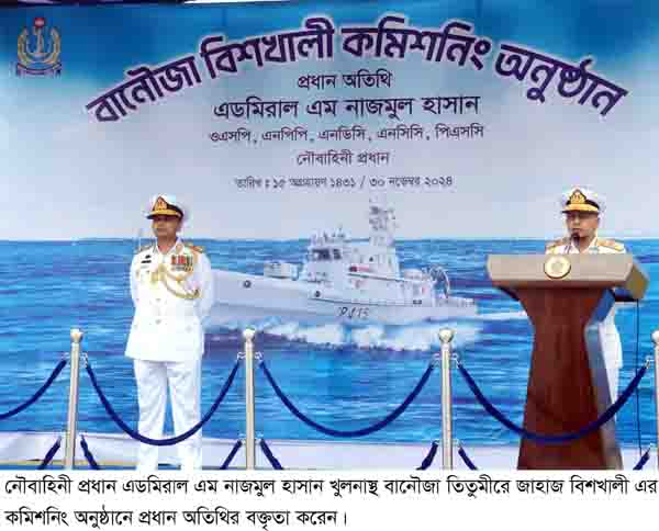 বাংলাদেশ নৌবাহিনী ‘জাহাজ বিশখালী’ এর কমিশনিং অনুষ্ঠান আজ ৩০ নভেম্বর ২০২৪ রোজ শনিবার সকালে খুলনাস্থ বানৌজা তিতুমীরে অনুষ্ঠিত হয়। অনুষ্ঠানে প্রধান অতিথি ছিলেন নৌবাহিনী প্রধান এডমিরাল এম নাজমুল হাসান।