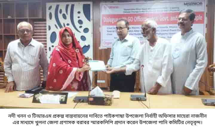 তৃপ্তি রঞ্জন সেন, পাইকগাছা (খুলনা) প্রতিনিধি : পাইকগাছার ঐতিহ্যবাহী শিবসা ও হাঁড়িয়া নদী খনন করে এই অববাহিকায় টিআরএম প্রকল্প বাস্তবায়ন, পৌরসভা সহ ১০ টি ইউনিয়নের উপকূলীয় টেকসই বেড়িবাঁধ নির্মাণ ও পাইকগাছা পৌরসভা সহ উপজেলার জলাবদ্ধ এলাকার খাল দখল মুক্ত করে খননের মাধ্যমে নিষ্কাশন ব্যবস্থা কার্যকর করার দাবিতে স্মারকলিপি প্রদান করা হয়েছে। ২০ মার্চ ২০২৫ রোজ বৃহস্পতিবার দুপুরে উপজেলা নির্বাহী অফিসার মাহেরা নাজনীন এর মাধ্যমে খুলনা জেলা প্রশাসক বরাবর স্মারকলিপি প্রদান করেন উপজেলা পানি কমিটির নেতৃবৃন্দ। এসময় উপস্থিত ছিলেন কেন্দ্রীয় পানি কমিটির সদস্য সেলিম আখতার স্বপন, উপজেলা পানি কমিটির সহ সভাপতি মুক্তিযোদ্ধা রুহুল আমিন গাজী, সাধারণ সম্পাদক শেখ সাদেকুজ্জামান ও দিলীপ কুমার। এসময় পানি কমিটির সকল সদস্যরা উপস্থিত ছিলেন।