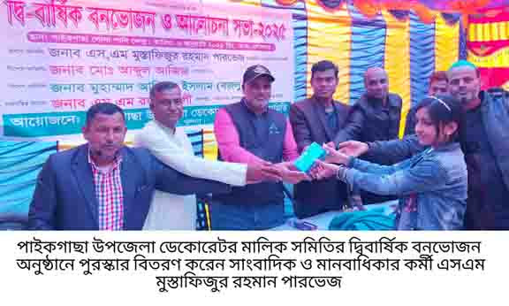 তৃপ্তি রঞ্জন সেন, পাইকগাছা (খুলনা) প্রতিনিধি : পাইকগাছা উপজেলা ডেকোরেটর মালিক সমিতির দ্বি-বার্ষিক বনভোজন, আলোচনা সভা ও পুরস্কার বিতরণী অনুষ্ঠান অনুষ্ঠিত হয়েছে। আজ ০৬ জানুয়ারি ২০২৫ রোজ সোমবার দুপুরে বাংলাদেশ মৎস্য গবেষণা ইনস্টিটিউট লোনাপানি কেন্দ্রে অনুষ্ঠিত সভায় সভাপতিত্ব করেন সমিতির সভাপতি