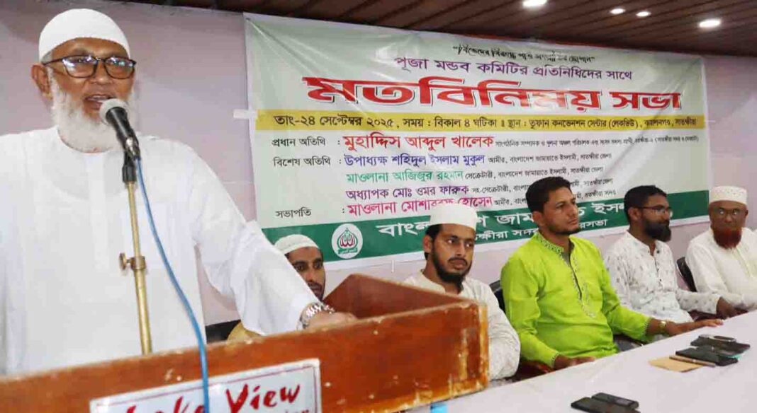 সদর উপজেলা জামায়াতের আমীর মাওলানা মোশারফ হোসেনের সভাপতিত্বে ও পৌর জামায়াতের সেক্রেটারি খোরশেদ আলম ও সদর সেক্রেটারী হাবিবুর রহমান সভাটি সঞ্চালনা করেন । সাম্প্রদায়িক সম্প্রীতির এক অনন্য উদাহরণ সাতক্ষীলা জেলায় অনুষ্ঠিত মত বিনিময় সভায় প্রধান অতিথি হিসেবে উপস্থিত ছিলেন সাতক্ষীরা ২ আসনের জামায়াতের এমপি প্রার্থী মুহাদ্দিস আব্দুল খালেক। বিশেষ অতিথি হিসেবে উপস্থিত ছিলেন: বাংলাদেশ পূজা উদযাপন পরিষদ সদর উপজেলার সভাপতি স্বপন কুমার শীল, সাধারণ স্পাদক অধ্যক্ষ শিবপদ গাইন স, সহভাপতি গোপাল চন্দ্র ঘোষাল, কাটিয়া সার্বজনীন মন্দিরের সভাপতি পৌর চন্দ্র দত, সাতক্ষীরা শহর জামায়াতের আমীর জাহিদুল ইসলাম। সভায় জেলা, পৌরসভা ও সদর উপজেলা পূজা উদযাপন পরিষদের নেতৃবৃন্দ, স্থানীয় রাজনৈতিক ব্যক্তিবর্গ এবং নাগরিক সমাজের প্রতিনিধিগণ উপস্থিত ছিলেন।
