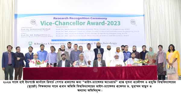 খুলনা প্রকৌশল ও প্রযুক্তি বিশ^বিদ্যালয়ের (কুয়েট) ২৭ জন শিক্ষক ভাইস-চ্যান্সেলর এ্যাওয়ার্ড পেয়েছেন । ২০২৩ সালে হাই ইমপ্যাক্ট জার্নালে রিসার্চ পেপার প্রকাশের জন্য কুয়েটের সংশ্লিষ্ট অনুষদের এক্সপার্ট প্যানেল কর্তৃক যাচাই-বাছাই পূর্বক উচ্চ শিক্ষা ও গবেষণা কমিটির (সিএএসআর) সুপারিশক্রমে এই অ্যাওয়ার্ড প্রদান করা হয়। আজ ২৭ নভেম্বর ২০২৪ রোজ বুধবার বিকালে বিশ্ববিদ্যালয়ের অডিটরিয়ামে প্রধান অতিথি হিসেবে উপস্থিত থেকে শিক্ষকদের মাঝে এই অ্যাওয়ার্ড প্রদান করেন বিশ্ববিদ্যালয়ের মাননীয় ভাইস-চ্যান্সেলর প্রফেসর ড. মুহাম্মদ মাছুদ। অনুষ্ঠানে বিশেষ অতিথি হিসেবে উপস্থিত ছিলেন সিভিল ইঞ্জিনিয়ারিং অনুষদের ডিন প্রফেসর ড. মুহাম্মদ হারুনুর রশীদ, ইইই অনুষদের ডিন প্রফেসর ড. মোঃ রফিকুল ইসলাম, মেকানিক্যাল ইঞ্জিনিয়ারিং অনুষদের ডিন প্রফেসর ড. মোঃ সাহিদুল ইসলাম, সায়েন্স এন্ড হিউম্যানিটিস অনুষদের ডিন প্রফেসর ড. মোঃ আবুল কালাম আজাদ। সভাপতিত্ব করেন পরিচালক (গবেষণা ও সম্প্রসারণ) প্রফেসর ড. মোহাঃ রফিকুল ইসলাম। অ্যাওয়ার্ড প্রাপ্ত শিক্ষকরা হলেন সিভিল ইঞ্জিনিয়ারিং বিভাগের প্রফেসর ড. মুহাম্মদ শাহজাহান আলী, প্রফেসর ড. এইচএম ইকবাল মাহমুদ, প্রফেসর ড. মোঃ খালেকুজ্জামান, সহযোগী অধ্যাপক মোঃ হুমায়ুন কবীর, ইউআরপি বিভাগের সহকারী অধ্যাপক সৌমিত্র কুমার সরকার, প্রভাষক অর্পিতা বক্সী, বিইসিএম বিভাগের সহযোগী অধ্যাপক মোঃ হাবিবুর রহমান সবুজ, গণিত বিভাগের প্রফেসর ড. মোঃ হাসানুজ্জামান, পদার্থ বিজ্ঞান বিভাগের প্রফেসর ড. সুজিত কুমার শীল, রসায়ন বিজ্ঞান বিভাগের প্রফেসর ড. আবুল বাসার মোঃ মামুন জামাল, সহযোগী অধ্যাপক মোঃ মনিরুজ্জামান, ইনস্টিটিউট অব ডিজাস্টার ম্যানেজমেন্টের সহযোগী অধ্যাপক মোঃ রিয়াদ হোসেন, কম্পিউটার সায়েন্স এন্ড ইঞ্জিনিয়ারিং বিভাগের সহকারী অধ্যাপক আব্দুল আজিজ, সহকারী অধ্যাপক দোলা দাস, ইলেকট্রিক্যাল এন্ড ইলেকট্রনিক ইঞ্জিনিয়ারিং বিভাগের প্রফেসর ড. মোস্তফা জামান চৌধুরী, প্রফেসর ড. কল্যাণ কুমার হালদার, প্রফেসর ড. নরোত্তম কুমার রায়, সহকারী অধ্যাপক আবু সাঈদ মোঃ জান্নাতুল ইসলাম, ইলেক্ট্রনিক্স এন্ড কমিউনিকেশন ইঞ্জিনিয়ারিং বিভাগের প্রফেসর ড. মোঃ ফারুক হোসেন, প্রফেসর ড. মনির হোসেন, প্রফেসর ড. শেখ মোঃ রবিউল ইসলাম, ম্যাটেরিয়াল সায়েন্স এন্ড ইঞ্জিনিয়ারিং বিভাগের সহকারী অধ্যাপক জহিরুল ইসলাম, এনার্জি সায়েন্স এন্ড ইঞ্জিনিয়ারিং বিভাগের প্রফেসর ড. মোঃ হাসান আলী, লেদার ইঞ্জিনিয়ারিং বিভাগের প্রফেসর ড. মোঃ আবুল হাসেম, সহকারী অধ্যাপক সাদিয়া মিম, টেক্সটাইল ইঞ্জিনিয়ারিং বিভাগের সহকারী অধ্যাপক এ কে এম নায়েব উল হোসেন, সহকারী অধ্যাপক ড. মোঃ ইসমাইল হোসেন, সহকারী 