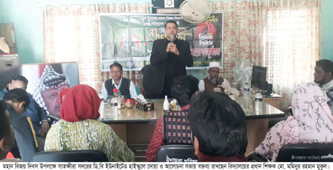 সাতক্ষীরা প্রতিনিধি : মহান বিজয় দিবস-২০২৫ উপলক্ষে দোয়া ও আলোচনা সভা অনুষ্ঠিত হয়েছে। আজ ১৬ ডিসেম্বর ২০২৫ রোজ মঙ্গলবার সকালে সদরের ডি.বি ইউনাইটেড হাইস্কুলের আয়োজনে বিদ্যালয়ের প্রধান শিক্ষকের অফিস কক্ষে ডি.বি ইউনাইটেড হাইস্কুলের প্রধান শিক্ষক মো. মমিনুর রহমান মুকুল এঁর সভাপতিত্বে আলোচনা সভায় মহান বিজয় দিবসের তাৎপর্য তুলে ধরে বক্তব্য রাখেন ডি.বি ইউনাইটেড হাইস্কুলের সহকারী প্রধান শিক্ষক কঙ্কন কুমার দাস, সিনিয়র শিক্ষক মোস্তাফিজুর রহমান, সহকারী শিক্ষক লুৎফুন্নেছা ডালিয়া ও সুকুমার সরকার প্রমুখ। আলোচনা সভার পূর্বে বিদ্যালয় প্রাঙ্গনে জাতীয় ও বিদ্যালয়ের পতাকা উত্তোলনের মধ্য দিয়ে মহান বিজয় দিবসের শুভ সূচনা করা হয়। পরে বিদ্যালয় প্রাঙ্গনে অবস্থিত শহীদ মিনারে মহান মুক্তিযুদ্ধের বীর শহীদদের প্রতি শ্রদ্ধা নিবেদন করে পুষ্পার্ঘ্য অর্পণ করা হয়। আলোচনা সভা শেষে মহান মুক্তিযুদ্ধে শহীদ বীর মুক্তিযোদ্ধাদের রুহের মাগফেরাত কামনা করে বিশেষ দোয়া ও মোনাজাত করা হয়। দোয়া ও মোনাজাত পরিচালনা করেন ডি.বি ইউনাইটেড হাইস্কুলের সিনিয়র শিক্ষক মাওলানা মো. মহসিন উদ্দিন। এসময় ডি.বি ইউনাইটেড হাইস্কুলের শিক্ষক ও শিক্ষার্থীরা উপস্থিত ছিলেন। সমগ্র অনুষ্ঠান সঞ্চালনা করেন ডি.বি ইউনাইটেড হাইস্কুলের সহকারী শিক্ষক মো. মুকুল হোসেন।