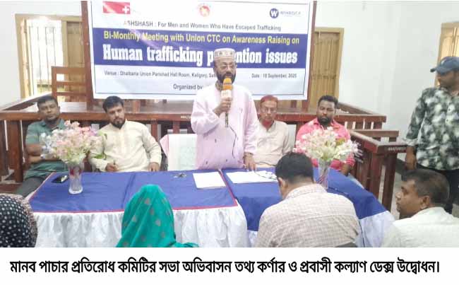 আশাশুনি (সাতক্ষীরা) প্রতিনিধি : রূপান্তরের আয়োজনে ইউনিয়ন মানব পাচার প্রতিরোধ কমিটির দ্বিমাসিক সভা, মানব পাচার প্রতিরোধ ও নিরাপদ অভিবাসন বিষয়ক তথ্য কর্ণার ও প্রবাসী কল্যাণ ডেক্স উদ্বোধন করা হয়েছে। আজ ১৮ সেপ্টেম্বর ২০২৫ রোজ বৃহস্পতিবার কালিগঞ্জের ধলবাড়িয়া ইউপি কার্যালয়ে এ অনুষ্ঠান করা হয়।