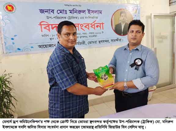 নিজস্ব প্রতিনিধি : সাতক্ষীরার ভোমরা স্থলবন্দর কর্তৃপক্ষের উপ-পরিচালক (ট্রাফিক) মো. মনিরুল ইসলামের বদলি জনিত বিদায় সংবর্ধনা প্রদান করা হয়েছে। আজ ১০ আগস্ট ২০২২ রোজ বুধবার ভোমরা স্থলবন্দর কর্তৃপক্ষের সভা কক্ষে মেসার্স ড্রপ কমিউনেকিশন’র পক্ষ থেকে এ বিদায়ী সংবর্ধনা প্রদান করা হয়। এসময় মেসার্স ড্রপ কমিউনেকিশন’র পক্ষ থেকে ভোমরাস্থ প্রতিনিধি সাতক্ষীরা পৌর আওয়ামী লীগের সাবেক সহ-দপ্তর সম্পাদক জিয়াউর বিন সেলিম যাদু ক্রেস্ট দিয়ে ভোমরা স্থলবন্দর কর্তৃপক্ষের উপ-পরিচালক (ট্রাফিক) মো. মনিরুল ইসলামকে বদলি জনিত বিদায় সংবর্ধনা প্রদান করেন।