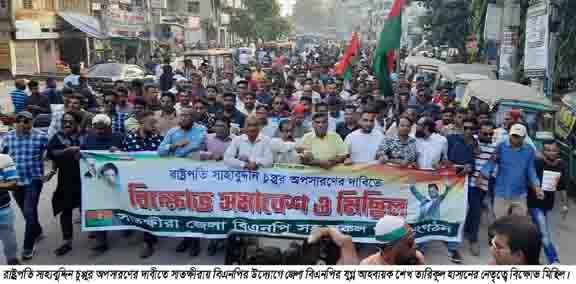 নিজস্ব প্রতিনিধি : সাতক্ষীরায় রাষ্ট্রপতি সাহাবুদ্দিন চুপ্পুর অপসারণের দাবীতে বিক্ষোভ সমাবেশ ও মিছিল অনুষ্ঠিত হয়েছে। ২২ অক্টোবর ২০২৪ রোজ মঙ্গলবার বিকালে সাতক্ষীরা জেলা বিএনপিসহ সকল অংগ সংগঠনের আয়োজনে শহরের পরিবহন কাউন্টার এলকায় জেলা বিএনপির যুগ্ন আহবায়ক শেখ তারিকুল হাসানের সভাপতিত্বে ও জেলা কৃষক দলের সাবেক আহবায়ক আহসানুল কাদির স্বপনের সঞ্চালনায় বিক্ষোভ সমাবেশে বক্তব্য রাখেন সাতক্ষীরা জেলা বিএনপির সদস্য আবুল হাসান হাদী, জেলা যুব দলের সাবেক সমন্বয়ক আইনুল ইসলাম নান্টা, পৌর বিএনপির সাবেক যুগ্ম সম্পাদক আব্দুল্লাহ আল-মামুন রাজু, জিয়া পরিষদের সদস্য সচিব প্রভাষক মনিরুজ্জামান, জেলা যুব দলের সাবেক সহ-সমন্বয়ক ফরিদ উদ্দিন, ছাত্র দলের সাবেক সভাপতি শেখ শরিফুজ্জামান সজিব, সাবেক সেক্রেটারী মমতাজুল ইসলাম চন্দন, যুগ্ম সাধারণ সম্পাদক রুহুল আমিন পাড়, আসাদুজ্জামান খোকা, সাইদুল ইসলাম হিমু, শিপলুর রহমান, সদর যুব দলের সদস্য সচিব মো. জাকির হোসেন, জেলা কৃষক দলের যুগ্ম আহবায়ক শামীম কবির সুমন, ফিরোজ শাহ ও শ্রমিক দলের রেজাউল ইসলাম রেজা প্রমুখ। বিক্ষোভ সমাবেশে বক্তারা বলেন, “১৯৭১ সালে পাকিস্থানী শাসক পলায়নের পর তাদের কোন পদত্যাগ পত্র শেখ মুজিবের কাছে ছিল না। সুতারাং শেখ হাসিনার পলায়নের পর তারও পদত্যাগের প্রয়োজন নেই। রাষ্ট্রপতি সাহাববুদ্দিন চুপ্পু মিথ্যাচার করেছেন। সাংবিধানিক রীতিকে উপেক্ষা করে দেশ ও জাতিকে সংকটের মধ্যে ফেলে দেয়ার চেষ্টা করছেন। তিনি শেখ হাসিনাকে রক্ষার গভীর ষড়যন্ত্রে লিপ্ত আছেন। বিধায় তিনি রাষ্ট্রপতি পদে থাকার নৈতিক অধিকার হারিয়েছেন। আমরা তার দ্রুত পদত্যাগ দাবী করছি।” বিক্ষোভ সমাবেশ শেষে একটি বিশাল বিক্ষোভ মিছিল বের হয়। বিক্ষোভ মিছিলে রাষ্ট্রপতি সাহাবুদ্দিন চুপ্পুর অপসারণের দাবীতে বিভিন্ন স্লোগানে স্লোগানে মুখরিত হয়ে ওঠে সাতক্ষীরা শহর। বিক্ষোভ মিছিলটি শহরের গুরুত্বপূর্ণ সড়ক প্রদক্ষিণ করে শেষ হয়। এসময় সাতক্ষীরা জেলা বিএনপিসহ সকল অংগ সংগঠনের নেতা-কর্মীরা উপস্থিত ছিলেন।