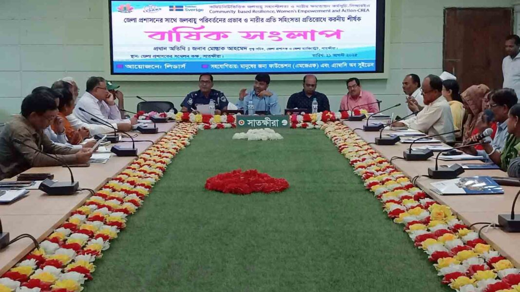 আজ ২১ আগস্ট ২০২৫ রোজ বৃহস্পতিবার সকালে লিডার্স এর আয়োজনে, মানুষের জন্য ফাউন্ডেশন (এমজেএফ) ও এম্বাসী অব সুইডেন এর সহযোগিতায় সাতক্ষীরা জেলা প্রশাসকের সম্মেলন কক্ষে কমিউনিটি ভিত্তিক জলবায়ু সহনশীলতা ও নারী ক্ষমতায়ন কর্মসূচি (সিআরইএ) এর আওতায় “জলবায়ু পরিবর্তনের প্রভাব ও নারীর সহিংসতা প্রতিরোধে করণীয়” শীর্ষক বার্ষিক সংলাপ অনুষ্ঠিত হয়। বীর মুক্তিযোদ্ধা মাষ্টার নজরুল ইসলাম এর সভাপতিত্বে প্রধান অতিথি হিসেবে উপস্থিত ছিলেন, জেলা প্রশাসক ও জেলা ম্যাজিস্ট্রেট মোস্তাক আহমেদ।