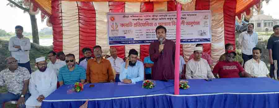 নিজস্ব প্রতিনিধি : “এসো দেশ বদলায় পৃথিবী বদলাই” এই প্রতিপাদ্যকে সামনে রেখে নতুন বাংলাদেশ গড়ার লক্ষ্যে তারুণ্যের উৎসব-২০২৫ উপলক্ষে সাতক্ষীরায় জেলা ক্রীড়া অফিসের উদ্যোগে কাবাডি প্রতিযোগিতা ও পুরস্কার বিতরণী অনুষ্ঠিত হয়েছে। আজ ২৪ সেপ্টেম্বর ২০২৫ রোজ বুধবার সকাল ১০টায় সাতক্ষীরা সদরের খেজুরডাঙ্গা আর.কে মাধ্যমিক বিদ্যালয় মাঠে ক্রীড়া পরিদপ্তরের বার্ষিক ক্রীড়া কর্মসূচি-২০২৫-২৬ এর আওতায় সাতক্ষীরা জেলা ক্রীড়া অফিসের আয়োজনে সাতক্ষীরা জেলা ক্রীড়া কর্মকর্তা মো. মাহবুবুর রহমানের সভাপতিত্বে কাবাডি প্রতিযোগিতা ও পুরস্কার বিতরণী অনুষ্ঠানে প্রধান অতিথি হিসেবে বক্তব্য রাখেন সাতক্ষীরা জেলা শিশু বিষয়ক কর্মকর্তা মো. রিয়াজুল ইসলাম। অনুষ্ঠানে বিশেষ অতিথি হিসেবে বক্তব্য রাখেন খেজুরডাঙ্গা আর.কে মাধ্যমিক বিদ্যালয়ের প্রধান শিক্ষক মো. হাবিবুর রহমান।