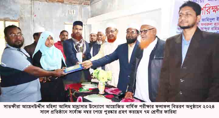 সাতক্ষীরা প্রতিনিধি : সাতক্ষীরা আয়েনউদ্দীন মহিলা আলিম মাদ্রাসার ২০২৪ সালের বার্ষিক পরীক্ষার ফলাফল ও পুরষ্কার বিতরণ অনুষ্ঠিত হয়েছে। আজ ৩০ ডিসেম্বর ২০২৪ রোজ সোমবার দুপুর ১২টায় মাদ্রাসার হলরুমে অনুষ্ঠিত বার্ষিক পরীক্ষার ফলাফল ঘোষণা ও পুরস্কার বিতরণী সভার সভাপতিত্ব করেন প্রতিষ্ঠানটির অধ্যক্ষ মো: রুহুল আমিন। অনুষ্ঠানের প্রধান অতিথি সাতক্ষীরা শহর জামায়াতের আমীর জাহিদুল ইসলাম শিক্ষার্থীদের মাঝে পুরষ্কার বিতরণ করেন।