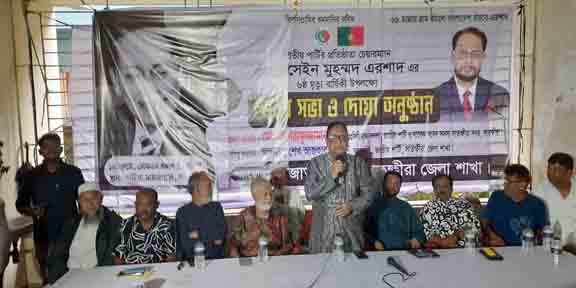 সাতক্ষীরা প্রতিনিধি : “৬৮ হাজার গ্রাম বাঁচলে বাংলাদেশ বাঁচবে এই স্লোগানকে সামনে রেখে” প্রয়াত সাবেক সফল রাষ্ট্রপতি জাতীয় পার্টির প্রতিষ্ঠাতা চেয়ারম্যান হুসেইন মুহম্মদ এরশাদ এঁর ৬ষ্ঠ মৃত্যুবার্ষিকী উপলক্ষে স্মরণ সভা ও দোয়া অনুষ্ঠান অনুষ্ঠিত হয়েছে। আজ ১৪ জুলাই ২০২৫ রোজ সোমবার দুপুরে জাতীয় পার্টির অস্থায়ী কার্যালয় সাবেক সংসদ সদস্য এমএ জব্বারের বাসভবনে জেলা জাতীয় পার্টির আয়োজন জেলা জাতীয় পার্টির সভাপতি আলহাজ্ব শেখ আজহার হোসেনের সভাপতিত্বে প্রধান অতিথি হিসেবে বক্তব্য রাখেন, সাতক্ষীরা-০২ আসনের সাবেক সংসদ সদস্য ও জাতীয় পার্টির প্রেসিডিয়াম সদস্য আশরাফুজ্জামান (আশু)। প্রধান অতিথির বক্তব্যে তিনি বলেন, হোসাইন মোহাম্মদ এরশাদ এর জন্ম না হলে জাতীয় পার্টির জন্ম হতো না, এমন নেতার জন্ম না হলে উপজেলার জন্ম হতো না। হোসাইন মুহম্মদ এরশাদের রাষ্ট্র পরিচালনা কালীন দেশটাকে যেভাবে সাজিয়েছিল আজকে তা অনেক পরিবর্তন হয়েছে। বর্তমানে দেশে আইনের শাসন নেই, যেখানে সেখানে মানুষকে হত্যা করা হচ্ছে। সারাদেশে গুম, খুন, হত্যা, অন্যায় অত্যাচার বেড়েই চলেছে। পাথর নিক্ষেপ করে প্রকাশ্য দিবালোকে নির্মমভাবে হত্যা করা হলো সোহাগ নামের এক যুবককে। সারা দেশে এটা নিয়ে তোলপাড় হয়েছে। এভাবে চলতে পারে না। দ্রুত নির্বাচন দিয়ে আইনের শাসন প্রতিষ্ঠিত করতে হবে। তিনি আরো বলেন, আমি মাত্র ৭ মাস জাতীয় সংসদের সদস্য ছিলাম। এই অল্প সময়ের মধ্যেই আমি প্রমাণ করেছি, রাজনীতিতে সৌজন্যতা ও ন্যায়ের কোনো বিকল্প নেই। আমার নির্বাচনী এলাকায় জামায়াত-বিএনপির একটি নেতাকেও বিনা কারণে গ্রেপ্তার হতে দেইনি। কারও বিরুদ্ধে অন্যায়ভাবে কোনো মামলা হয়নি, কাউকে হয়রানি করা হয়নি। কারণ আমি বিশ্বাস করি, রাজনৈতিক মতাদর্শ যাই হোক না কেন, সবার জন্য ন্যায়বিচার ও আইনের শাসন সমানভাবে প্রযোজ্য। আমি সবসময়ই চেষ্টা করেছি একটি সহনশীল রাজনৈতিক পরিবেশ বজায় রাখতে, যেখানে মতভেদ থাকবে, কিন্তু প্রতিহিংসা নয়। এটাই গণতন্ত্রের সৌন্দর্য।তিনি আরও বলেন, বর্তমানে যেভাবে মব সন্ত্রাস বাড়ছে, তা অত্যন্ত উদ্বেগজনক। রাজনীতিকে সন্ত্রাসমুক্ত রাখতে হলে আমাদের দলমত নির্বিশেষে একত্রিত হয়ে কাজ করতে হবে। দেশের স্বার্থে, মানুষের নিরাপত্তার স্বার্থে সবাইকে এগিয়ে আসতে হবে। আমি সকল রাজনৈতিক দলকে আহ্বান জানাই—আসুন, সহিংসতা নয়, যুক্তি ও সহনশীলতার মাধ্যমে আমরা দেশ পরিচালনায় অবদান রাখি। ঐক্যবদ্ধভাবে শান্তি ও গণতন্ত্রের পথে হাঁটি।আমরা চাই, জাতীয় পার্টিকে সাতক্ষীরায় আবারও ক্ষমতায় আনতে হবে । প্রতিটা ওয়ার্ড ও ইউনিয়ন পর্যায়ে জাতীয় পার্টিকে আরো শক্তিশালী করে গড়ে তুলতে হবে।