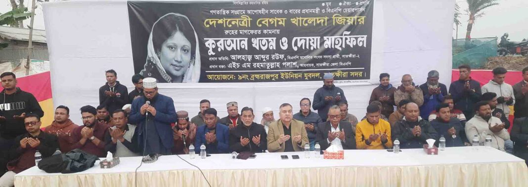 সাতক্ষীরা প্রতিনিধি : গণতান্ত্রিক সংগ্রামে আপোষহীন ৩বারের প্রধানমন্ত্রী ও বিএনপি চেয়ারপার্সন বেগম খালেদা জিয়ার রুহের মাগফিরাত কামনায় কোরআন খতম ও দোয়া মাহফিল অনুষ্ঠিত হয়েছে। আজ ১৫ জানুয়ারি ২০২৬ রোজ বৃহস্পতিবার বিকালে ব্রহ্মরাজপুর ইউনিয়নের পূর্ব দহাখুলা ভাটার মোড়ে ব্রহ্মরাজপুর ইউনিয়ন যুবদলের আয়োজনে যুবদল নেতা ইনসাফ আলীর সভাপতিত্বে মিলাদ ও দোয়া মাহফিলে প্রধান অতিথি হিসেবে বক্তব্য রাখেন সাতক্ষীরা-২ (সাতক্ষীরা সদর-দেবহাটা) আসনে জাতীয়তাবাদী দল বিএনপি মনোনীত ধানের শীষের প্রার্থী আলহাজ্ব মো. আব্দুর রউফ। প্রধান অতিথির বক্তব্যে তিনি আপোষহীন দেশনেত্রী বেগম খালেদা জিয়ার রুহের মাগফেরাত কামনা করে বলেন, দেশনেত্রী বেগম খালেদা জিয়া দেশ ও দেশের মানুষের কল্যাণে সারা জীবন নিরলসভাবে কাজ করে গেছেন। দেশনেত্রীকে দেশের মানুষ ভালোবাসে বলেই তাঁর জানাযায় কোটি কোটি মানুষ অংশ নিয়েছে। ৭-৮ ঘন্টা দাঁড়িয়ে অপেক্ষা করে জানাজায় অংশ নিয়েছে। তিনি মানুষের হৃদয়ে ও ধানের শীষের মাঝেই বেঁচে থাকবেন।