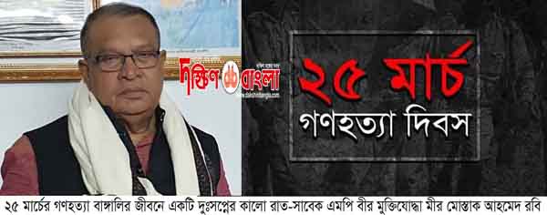 মাহফিজুল ইসলাম আককাজ : ২৫ মার্চের গণহত্যা বাঙ্গালির জীবনে একটি দুঃসপ্নের কালো রাত। এই রাতে পাকিস্থানী সামরিক বাহিনী অপারেশন সার্চলাইটের নামে গণহত্যাযজ্ঞ চালিয়েছিল। ১৯৭১ সালের ২৫ মার্চ মধ্যরাতে পাকিস্থানী হানাদার বাহিনী ঘুমন্ত নিরস্ত্র বাঙালির ওপর আধুনিক যুদ্ধাস্ত্র নিয়ে ঝাঁপিয়ে পড়েছিল। ২৫ মার্চ এই গণহত্যাকে গভীরভাবে শ্রদ্ধার সাথে স্মরণ ও শহিদদের রুহের মাগফিরাত কামনা করে সাতক্ষীরা-২আসনের বারবার নির্বাচিত সাবেক সংসদ সদস্য ও জেলা আওয়ামী লীগের ভারপ্রাপ্ত সভাপতি নৌ-কমান্ডো ০০০১বীর মুক্তিযোদ্ধা মীর মোস্তাক আহমেদ রবি বলেছেন, “২৫ মার্চের গণহত্যা শুধু বাংলাদেশেরই নয়, বিশ্বমানবতার ইতিহাসেও একটি কালো অধ্যায়। ১৯৭১ সালের এই দিনে পাকিস্থাানি হানাদার বাহিনী ঢাকাসহ সারাদেশে ইতিহাসের নৃশংসতম হত্যাকান্ড পরিচালনা করেছিল। বাঙালির মুক্তি আন্দোলনকে স্তব্ধ করে দিতে সংঘটিত এ গণহত্যায় শহিদ হন ছাত্র, শিক্ষক, বুদ্ধিজীবী, বিভিন্ন বাহিনী, বিশেষ করে পুলিশ ও তৎকালীন ইপিআর সদস্যসহ বিভিন্ন শ্রেণিপেশার অগণিত মানুষ।